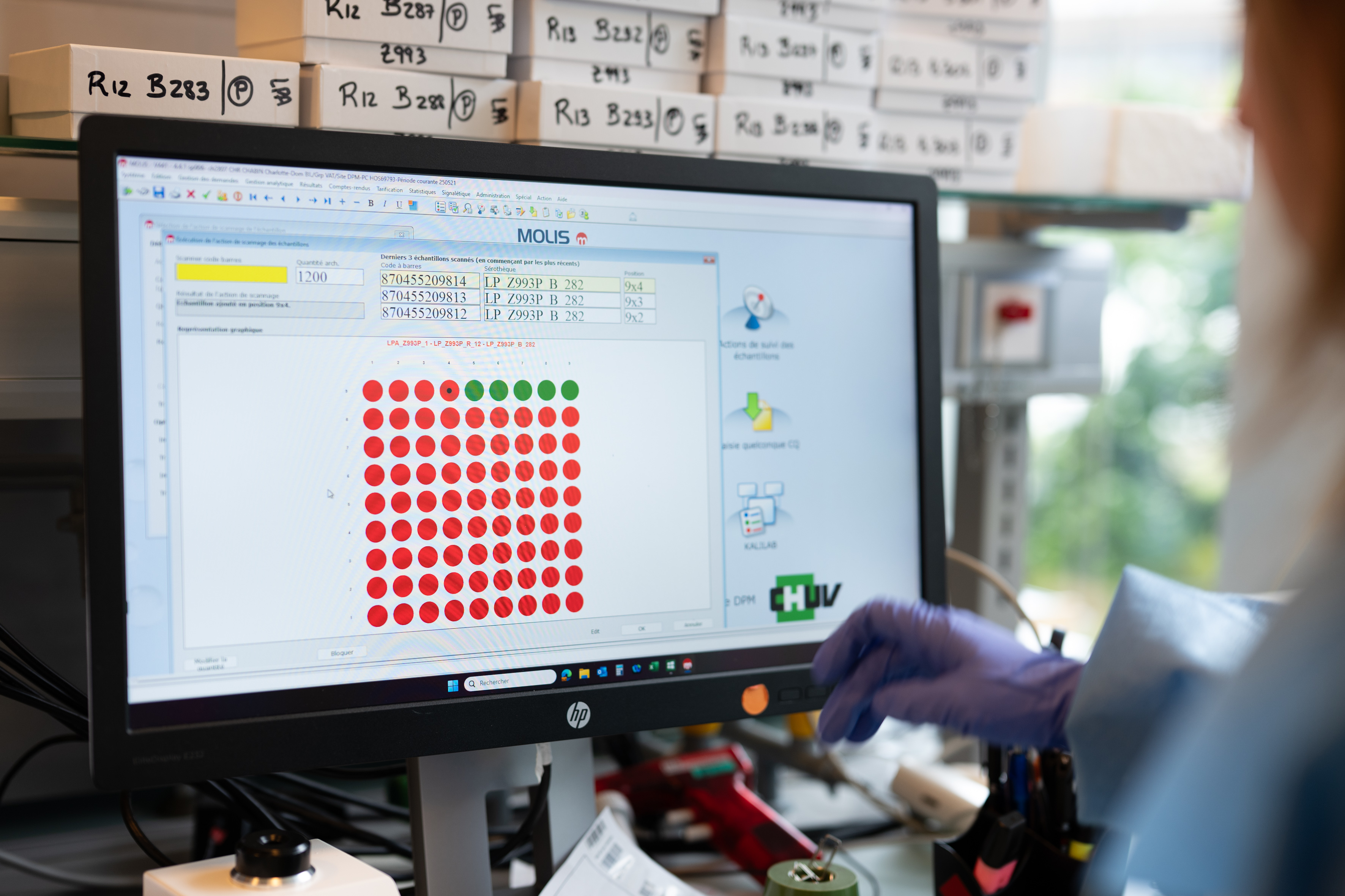 Au CHUV, il existe une banque bien particulière: la biobanque génomique (BGC), un espace extrêmement sécurisé qui contient des échantillons d’ADN destinés à la recherche. «Inaugurée en 2013, elle offre une solution clé-en-mains pour les chercheuses et chercheurs, les aidant dans leurs projets et leur permettant de gagner un temps précieux», explique Elodie Ristorcelli, responsable du laboratoire qui gère la biobanque. En effet, en recherche, la phase de collecte comporte des contraintes logistiques importantes, allant du recrutement des participant-es au prélèvement et à la gestion des échantillons (préparation, contrôle qualité, conservation). Et des échantillons, la biobanque génomique en contient un certain nombre: plus de 40'000 patient-es ont en effet accepté de partager leur ADN. «Lorsqu’une personne est admise au CHUV, elle reçoit une brochure d’information sur le consentement général où elle peut indiquer sa volonté de participer à la collecte. Un tube supplémentaire est alors prélevé lors d’une prise de sang effectuée pour les soins.» Les échantillons sont essentiellement utilisés pour étudier l’influence des facteurs génétiques sur les pathologies. «C’est le cas en oncologie où les questions de prédisposition génétique sont centrales dans la recherche ainsi que dans de nombreuses autres spécialités comme la pharmacologie, l’infectiologie ou la cardiologie.» Visite guidée au cœur de la biobanque génomique du CHUV.