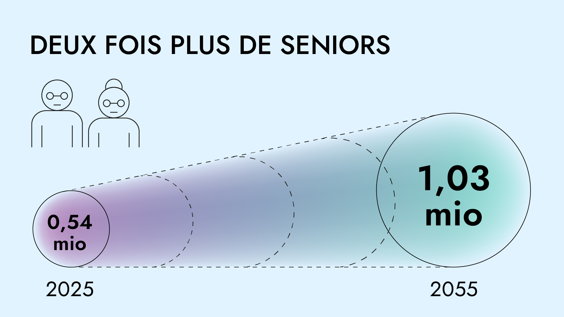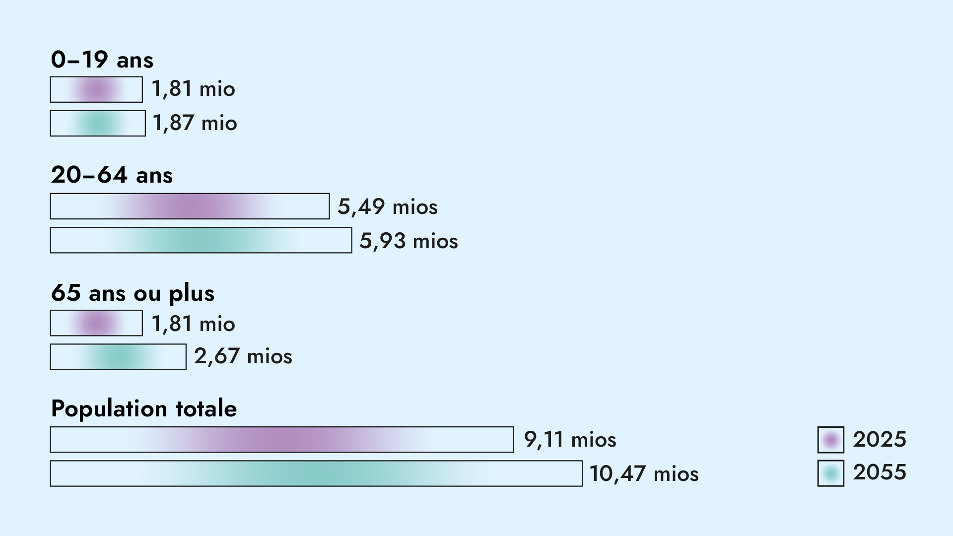 Source: pour les données liés à l'âge: «scénarios de l'évolution de la population de la Suisse et des cantons 2025-2055», OFS.